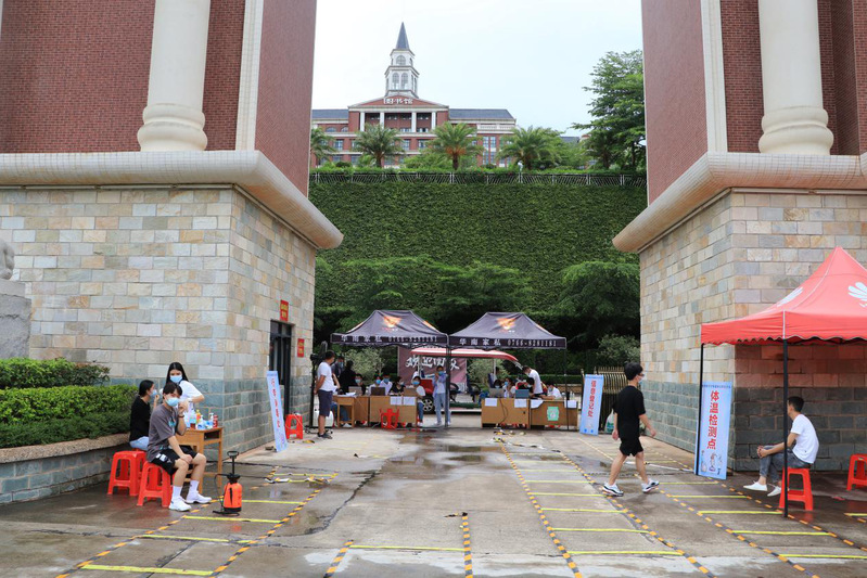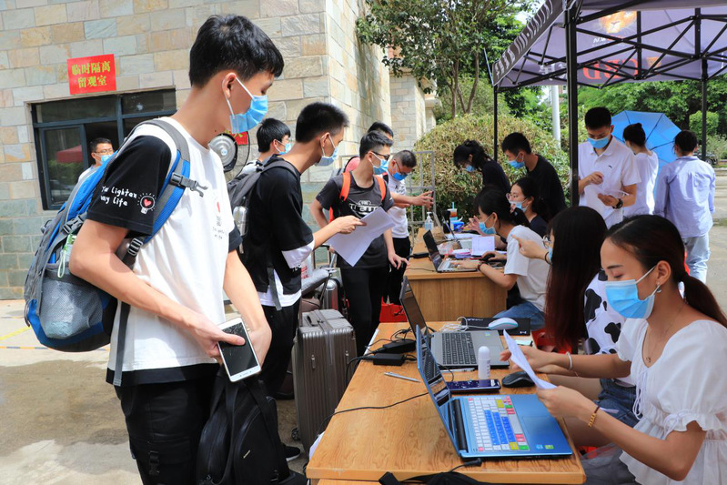 教師和學(xué)生志愿者等待返校同學(xué)的到來(lái)