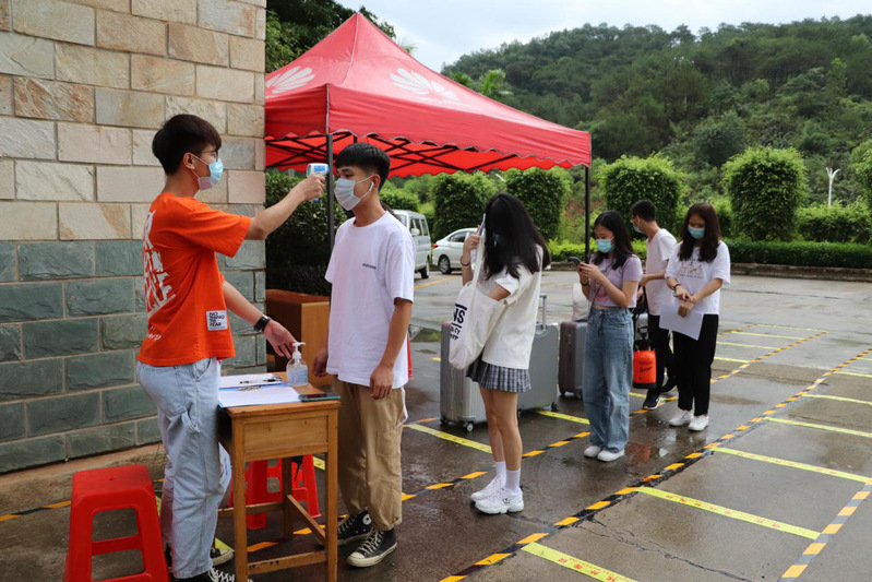 志愿者為返校同學(xué)檢測(cè)體溫和行李消毒