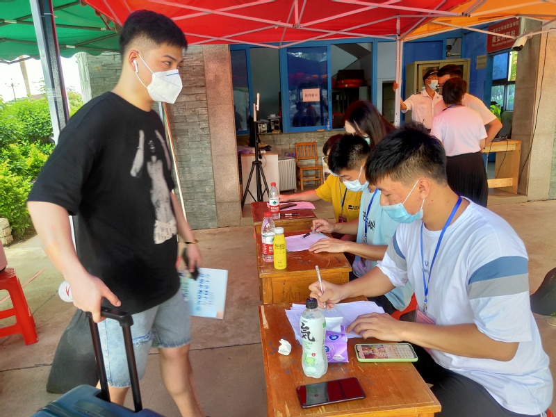 當(dāng)天上午,學(xué)校的正大門早早搭起了帳篷,返校的學(xué)生入校需經(jīng)過各個(gè)關(guān)卡,通過檢測體溫、查驗(yàn)葵花碼、查看移動(dòng)軌跡,對行李和身體表面消毒,查驗(yàn)學(xué)生身份和核對學(xué)生宿舍信息等多道程序,方能入校。