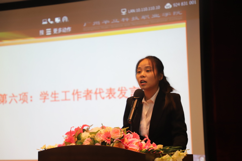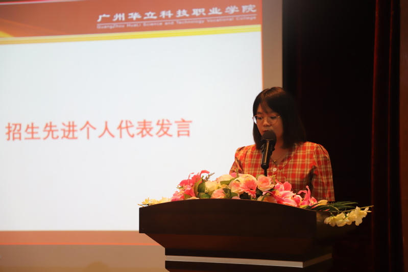 優(yōu)秀招生人員代表宋依謎老師在發(fā)言中從招生宣傳、招生方式等方面仔細(xì)地介紹自己的招生工作,表示從一名普通輔導(dǎo)員成為具有一定招生能力的教師,自己的成長(zhǎng)離不開(kāi)學(xué)校的栽培,心里充滿感恩,充滿動(dòng)力,對(duì)未來(lái)充滿信心。