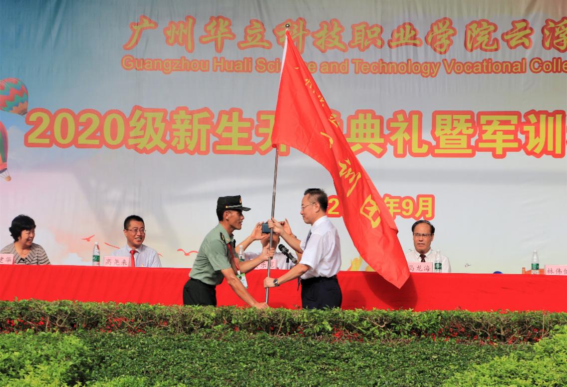 大會(huì)最后,由學(xué)校黨委書記林偉健向承訓(xùn)部隊(duì)教官代表授軍訓(xùn)團(tuán)團(tuán)旗。