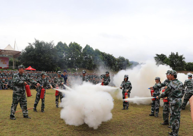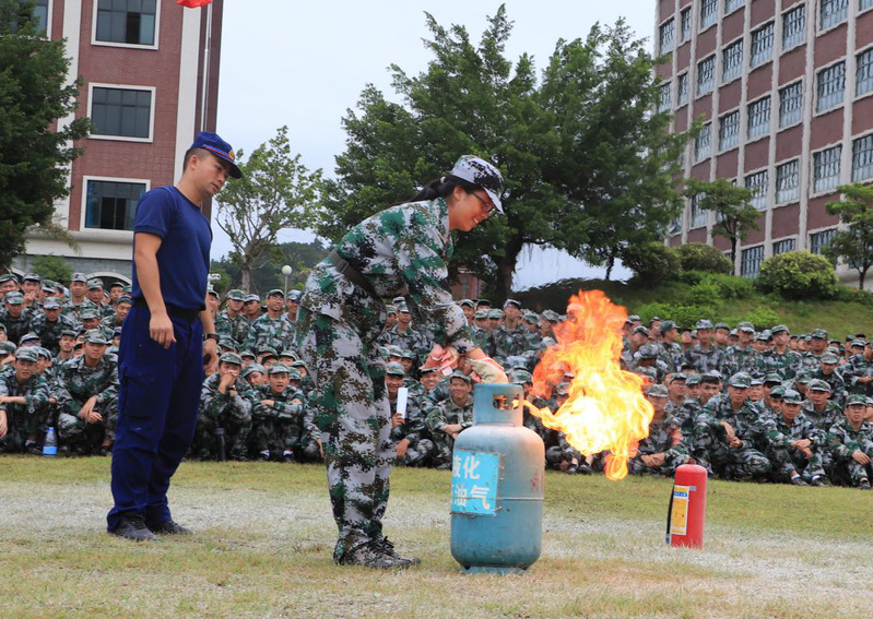 同學們進行了模擬火災疏散急救,親自體驗現場滅火的過程。面對熊熊燃燒的火堆,學生代表神情專注、沉著應對,熟練地按照滅火的步驟和方法,將汽油燃起的濃煙大火成功的迅速撲滅。