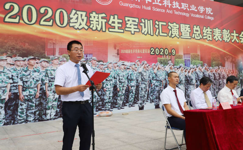 廣州校區(qū)2020級新生軍訓(xùn)匯演暨總結(jié)表彰大會在綜合樓廣場舉行。承訓(xùn)單位童勝雄中校,學(xué)校執(zhí)行校長馬龍海,副校長馬俊、高堯來,各二級學(xué)院負(fù)責(zé)人出席并在主席臺就坐。學(xué)生處副處長宋海泉主持。