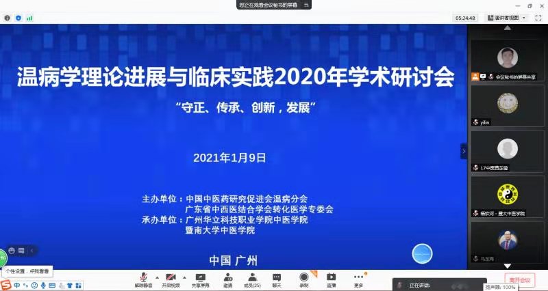 2021年1月9日由中國中醫(yī)藥研究促進(jìn)會溫病分會、廣東省中西醫(yī)結(jié)合學(xué)會轉(zhuǎn)化醫(yī)學(xué)專業(yè)委員會主辦,廣州華立科技職業(yè)學(xué)院中醫(yī)藥學(xué)院、暨南大學(xué)中醫(yī)學(xué)院共同承辦的以“傳承、守正、創(chuàng)新、發(fā)展”為主題的全國溫病學(xué)理論進(jìn)展與臨床實(shí)踐學(xué)術(shù)交流大會以騰訊會議的形式在線圓滿舉行。開幕式由我校中醫(yī)藥學(xué)院院長楊欽河教授主持。