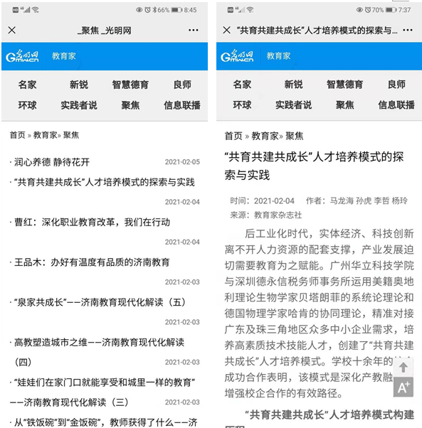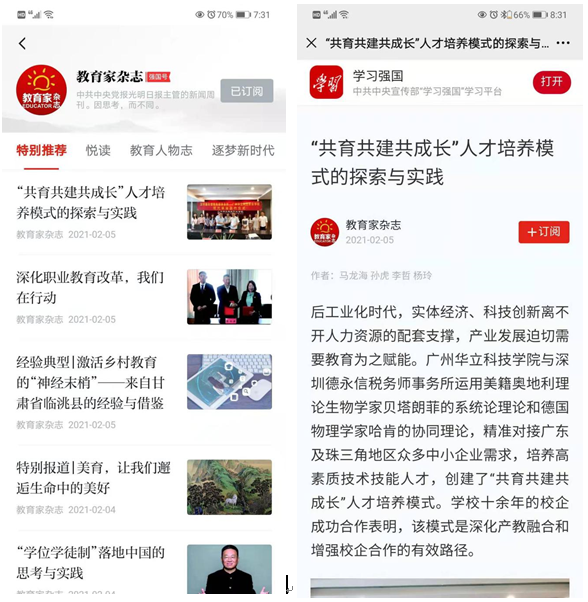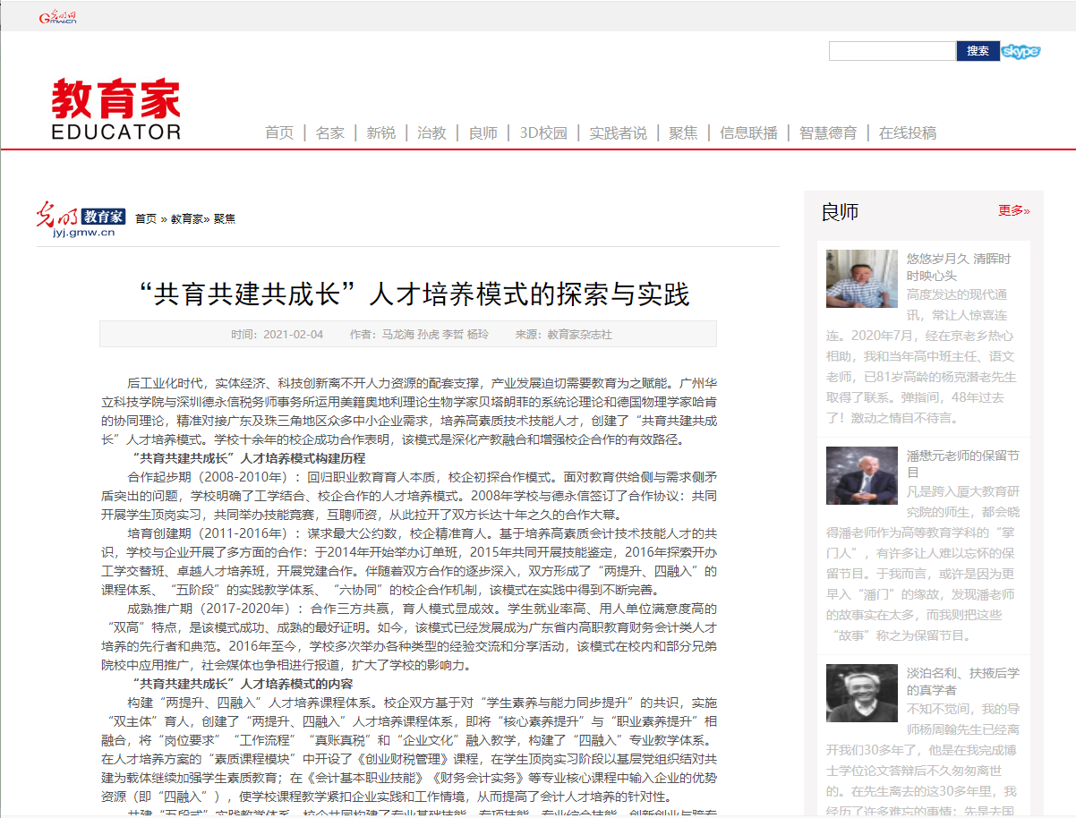 近日,我校會計專業(yè)《“共育共建共成長”人才培養(yǎng)模式的探索與實踐》成功在《教育家》雜志發(fā)表,不僅如此,該文還登上了光明網(wǎng)和“學(xué)習(xí)強國”APP。《教育家》雜志由光明日報主管,是中共中央黨報主管的教育主流媒體,其依托《光明日報》在知識界、文化界、教育界、理論界的權(quán)威影響力,致力于打造深度與廣度并重、專業(yè)與內(nèi)涵并包的高端期刊。