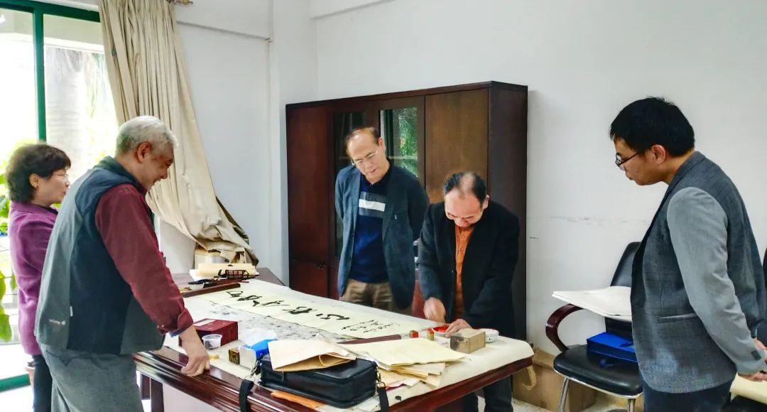隨后,陳明副主席一行到行政樓與學(xué)校領(lǐng)導(dǎo)進(jìn)行座談交流和工作研討。校黨委書記林偉健教授介紹學(xué)校的黨建工作和文化建設(shè)、專業(yè)建設(shè)等情況,并就慶祝建黨一百周年、黨史學(xué)習(xí)教育等方面的工作和大家作了深入探討,提出了工作思路和合作內(nèi)容。下午,藝術(shù)家們在學(xué)校舉行筆會,現(xiàn)場揮毫,創(chuàng)作了“風(fēng)濤百年,功德千秋”“心有所信,方能遠(yuǎn)行”“十萬和諧”“欣欣向榮”等多件書法作品和國畫作品,其精湛高超的藝術(shù)造詣得到大家的高度贊賞。