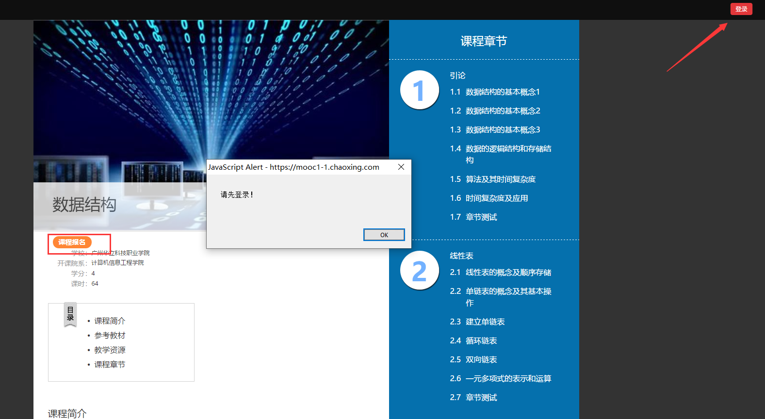 1.獲取課程鏈接后進(jìn)入,當(dāng)選擇課程報名時,會提示“請先登錄?!秉c擊右上角“登錄”并進(jìn)行賬號注冊(如已有超星平臺賬號則可直接登錄)。