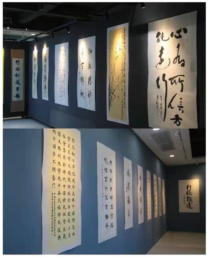 本次書畫展由廣州華立科技職業(yè)學(xué)院黨委主辦,以“千秋偉業(yè)、百年風(fēng)華“為主題 ,展出了近百幅作品,主題突出,內(nèi)容積極向上,藝術(shù)特色鮮明。廣東省書法家協(xié)會會員、廣東省直屬機關(guān)書法家協(xié)會副主席、華立職院黨委書記林偉健教授的“好大王隸書”書法作品憨態(tài)古樸、別具一格,其行草書法作品行云流水,流暢大度。校長劉莊教授書寫“立德樹人”,樸實端莊,引人注目。執(zhí)行校長馬龍海教授的篆書作品,曲中求圓,剛?cè)嵊卸取8毙iL馬俊副教授為展覽設(shè)計的背景展板,雍容大氣,充滿藝術(shù)感。中國書法家協(xié)會會員、著名書法家林少榮先生特地為本次展覽書寫“不忘初心,牢記使命”和“清平樂.六盤山”作品,剛遒健勁,大氣淋漓。廣東省宋慶齡基金會常務(wù)副主席、廣東省直屬機關(guān)美術(shù)家協(xié)會副主席陳明的國畫“十方和諧”,知名畫家、書法家徐衛(wèi)民、李顯達(dá)、雷顯峰和謝耀明等精心繪寫的作品,更是為展覽增色增光。