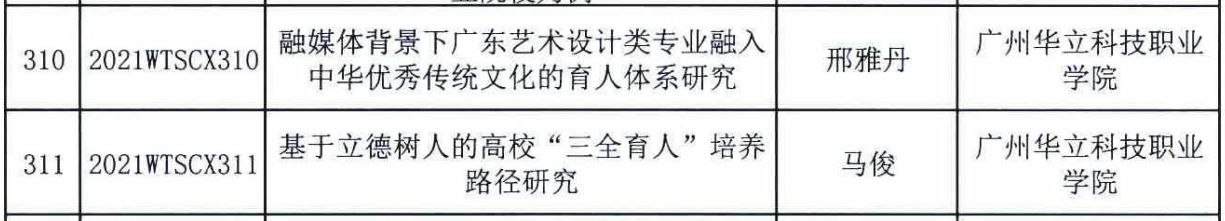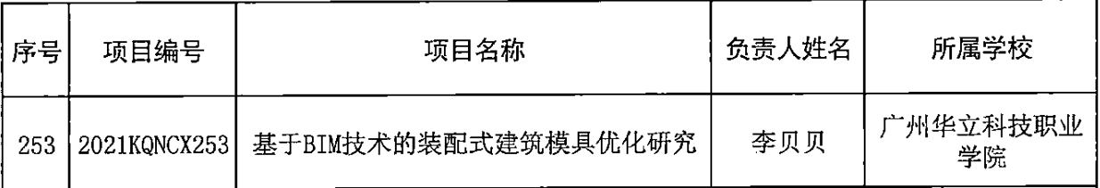 根據(jù)《廣東省教育廳關(guān)于開展2021年度廣東高??蒲衅脚_和科研項目申報工作的通知》,經(jīng)學校推薦、省教育廳組織專家評審,我校馬俊副校長《基于立德樹人的高?!叭恕迸囵B(yǎng)路徑研究》等3項課題獲特色創(chuàng)新類立項,李貝貝《基于BIM技術(shù)的裝配式建筑模具優(yōu)化研究》等3項課題獲青年創(chuàng)新類立項,希望課題負責人能夠按照教育廳要求,認真完成課題相關(guān)要求。
