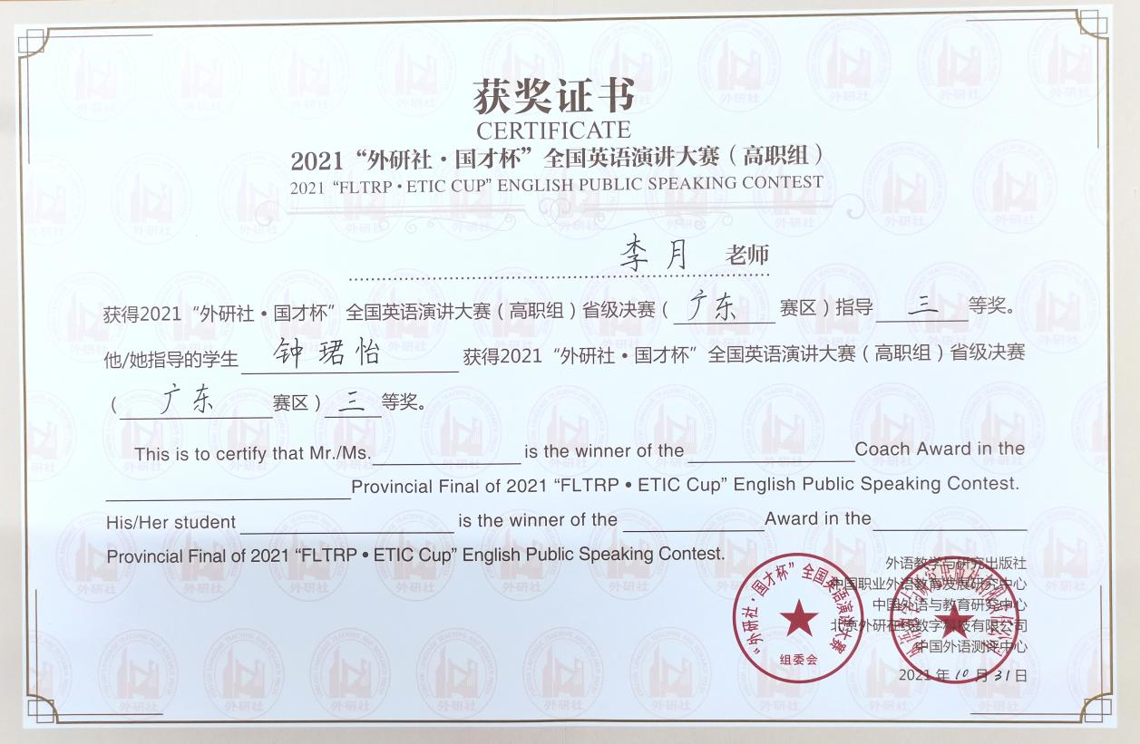鐘珺怡同學(xué)獲2021“外研社·國(guó)才杯”全國(guó)英語(yǔ)演講大賽(高職組)省級(jí)決賽(廣東賽區(qū))三等獎(jiǎng)