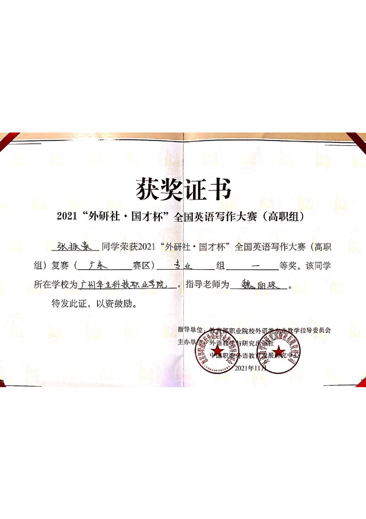 張振豪同學(xué)獲2021“外研社·國(guó)才杯”全國(guó)英語(yǔ)寫作大賽(高職組)復(fù)賽(廣東賽區(qū))專業(yè)組一等獎(jiǎng)