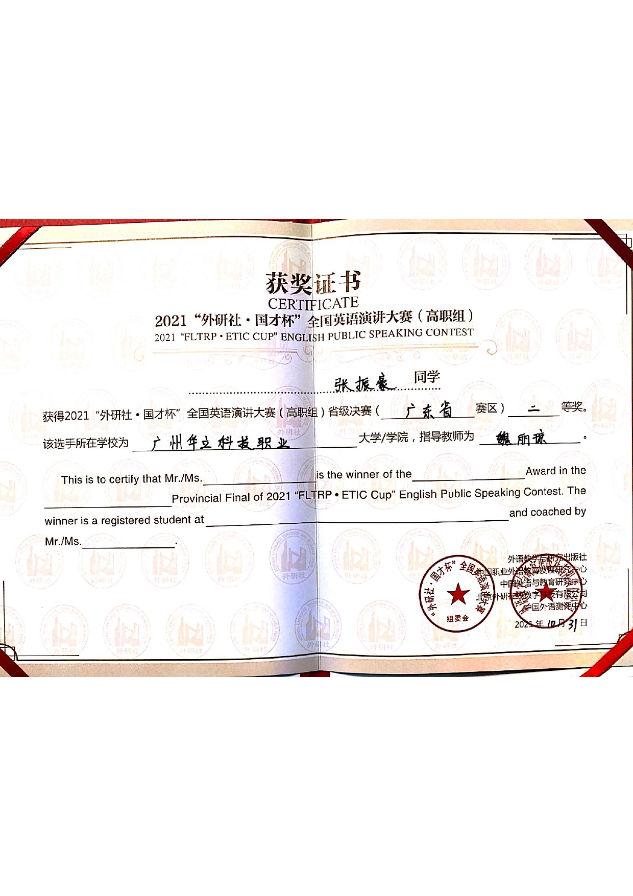張振豪同學(xué)獲2021“外研社·國(guó)才杯”全國(guó)英語(yǔ)演講大賽(高職組)省級(jí)決賽(廣東賽區(qū))二等獎(jiǎng)