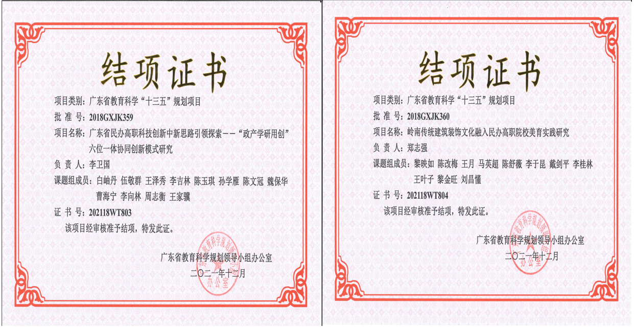 根據(jù)根據(jù)省教育廳、省財政廳制定的《廣東省高等教育“創(chuàng)新強校工程”實施方案(試行)》(粵教高函〔2014]8號)的要求,結(jié)合“廣東高校重大科研項目與成果培育計劃”結(jié)題要求,我校分別對周志衡老師等老師主持的廣東省教育廳普通高??蒲泻晚椖拷Y(jié)題相關規(guī)定,李衛(wèi)國、鄭志強老師主持的廣東省教育科學規(guī)劃項目相關結(jié)題規(guī)定,對申請結(jié)題的項目開展結(jié)題相關工作,并按時提交結(jié)題材料,經(jīng)過專家評審,全部課題通過驗收,特此祝賀。