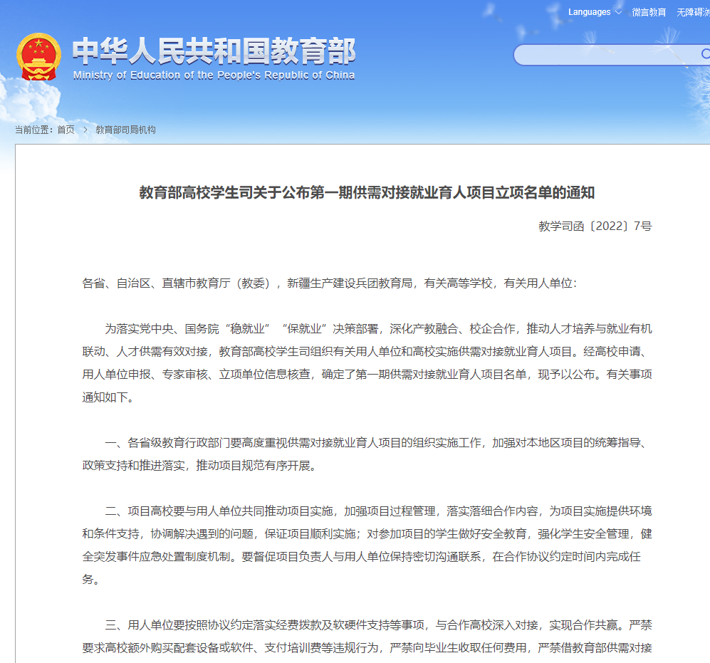 近日,教育部高校學(xué)生司《教育部高校學(xué)生司關(guān)于公布第一期供需對接就業(yè)育人項目立項名單的通知》(教學(xué)司函〔2022〕7號),我校獲得8項立項。其中,定向人才培訓(xùn)項目3項,就業(yè)實踐基地項目3項,人力資源項目培訓(xùn)2項。
