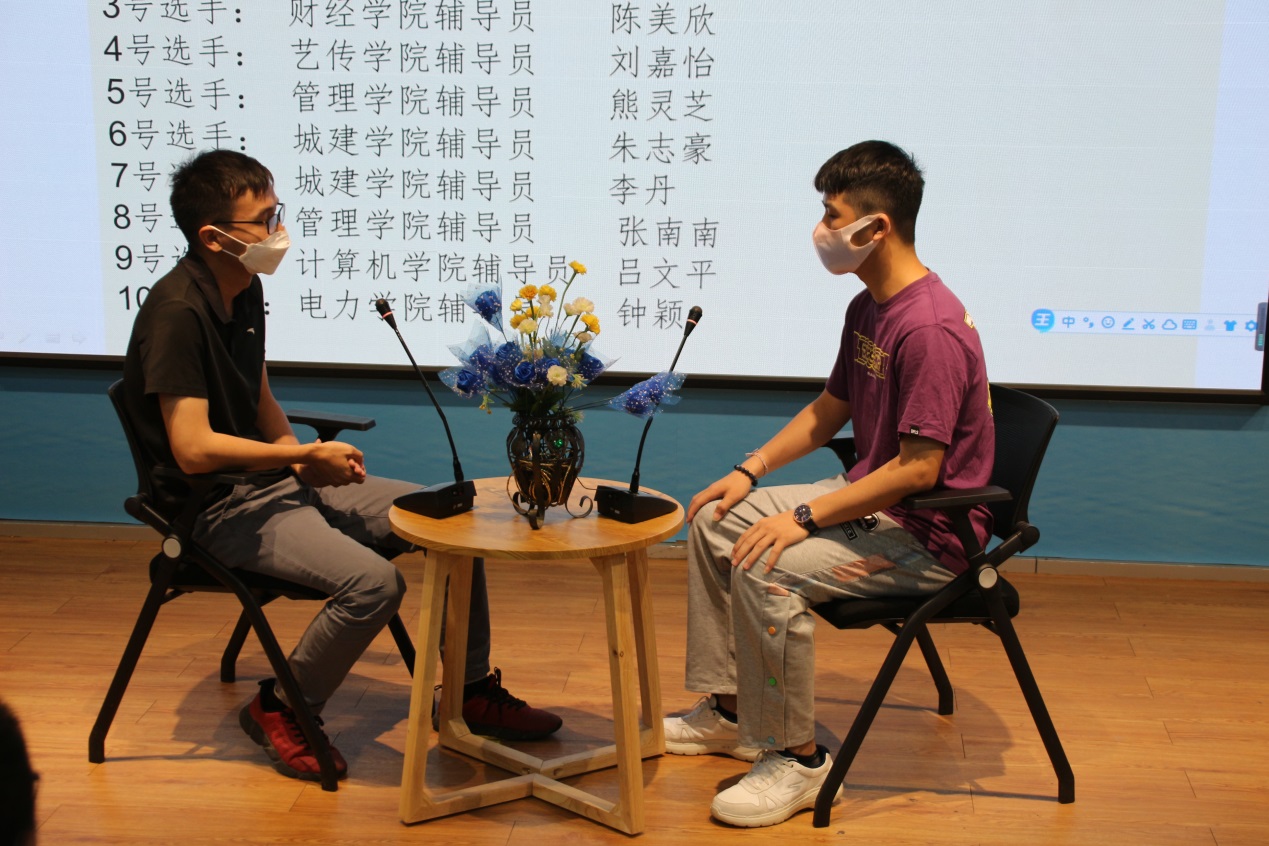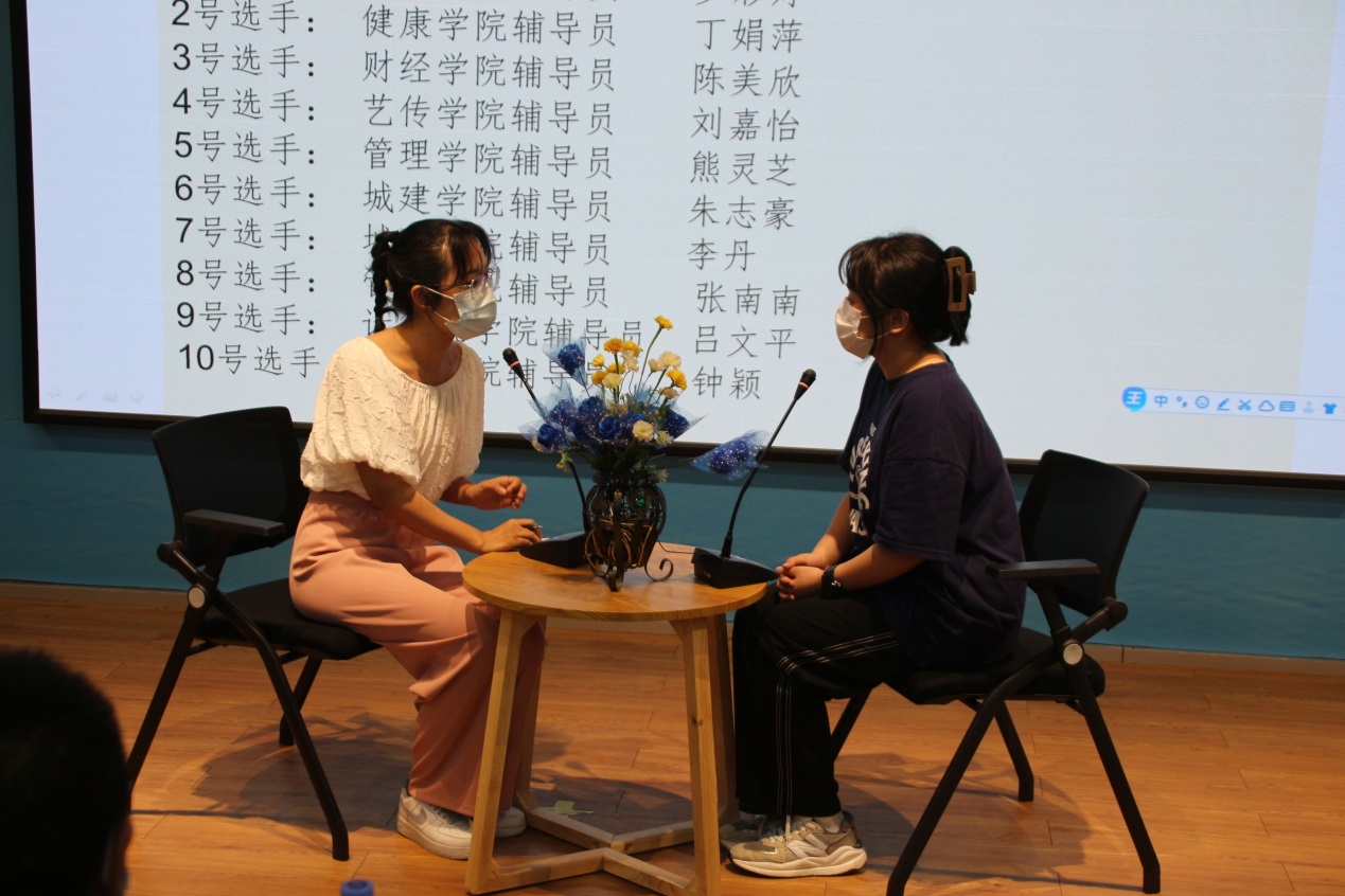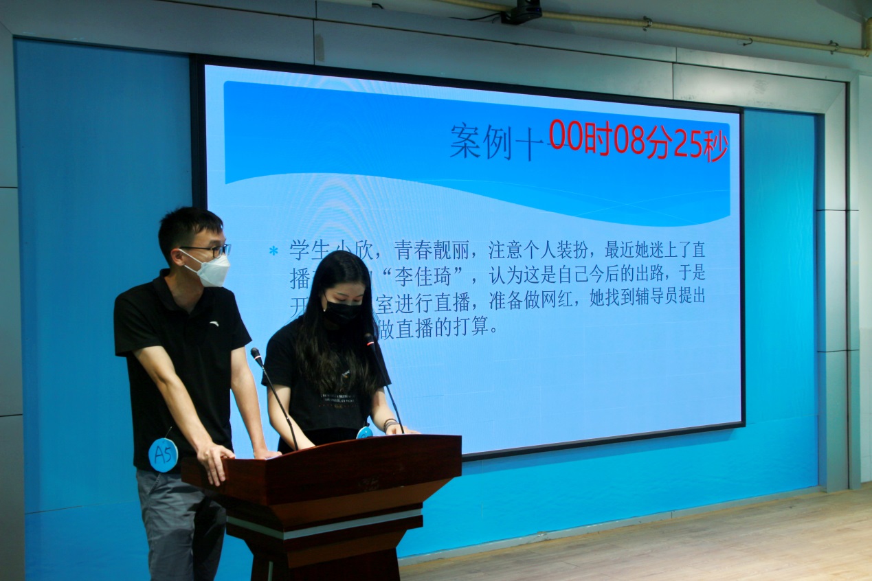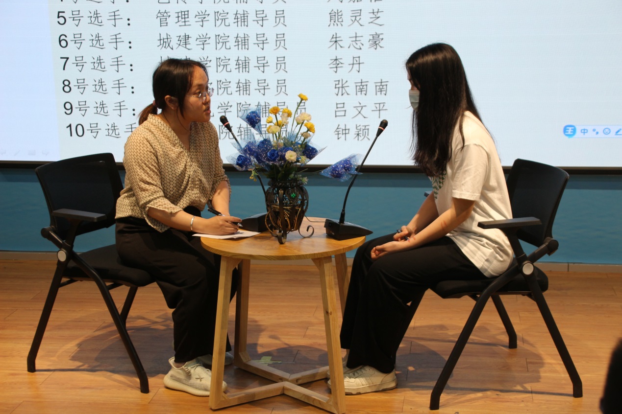 比賽分為案例研討和談心談話兩個項目,再現(xiàn)了當(dāng)下大學(xué)生思想政治教育和日常教育管理中的熱點難點問題,如疫情防控、價值取向、學(xué)業(yè)、就業(yè)、情感、人際關(guān)系、心理健康、學(xué)生干部培養(yǎng)等問題。案例研討以兩兩抽簽成組,“我提問,你回答”的方式開展。選手圍繞案例共同辨析原因、研討對策、總結(jié)規(guī)律。談心談話以情景再現(xiàn)的方式,參賽輔導(dǎo)員充分運用思想政治教育及相關(guān)學(xué)科原理、方法、策略,為“學(xué)生”答疑解惑、指明方向。參賽選手思路清晰、導(dǎo)向正確,充分展示了我校輔導(dǎo)員積極向上的精神面貌和較高的職業(yè)素養(yǎng)。