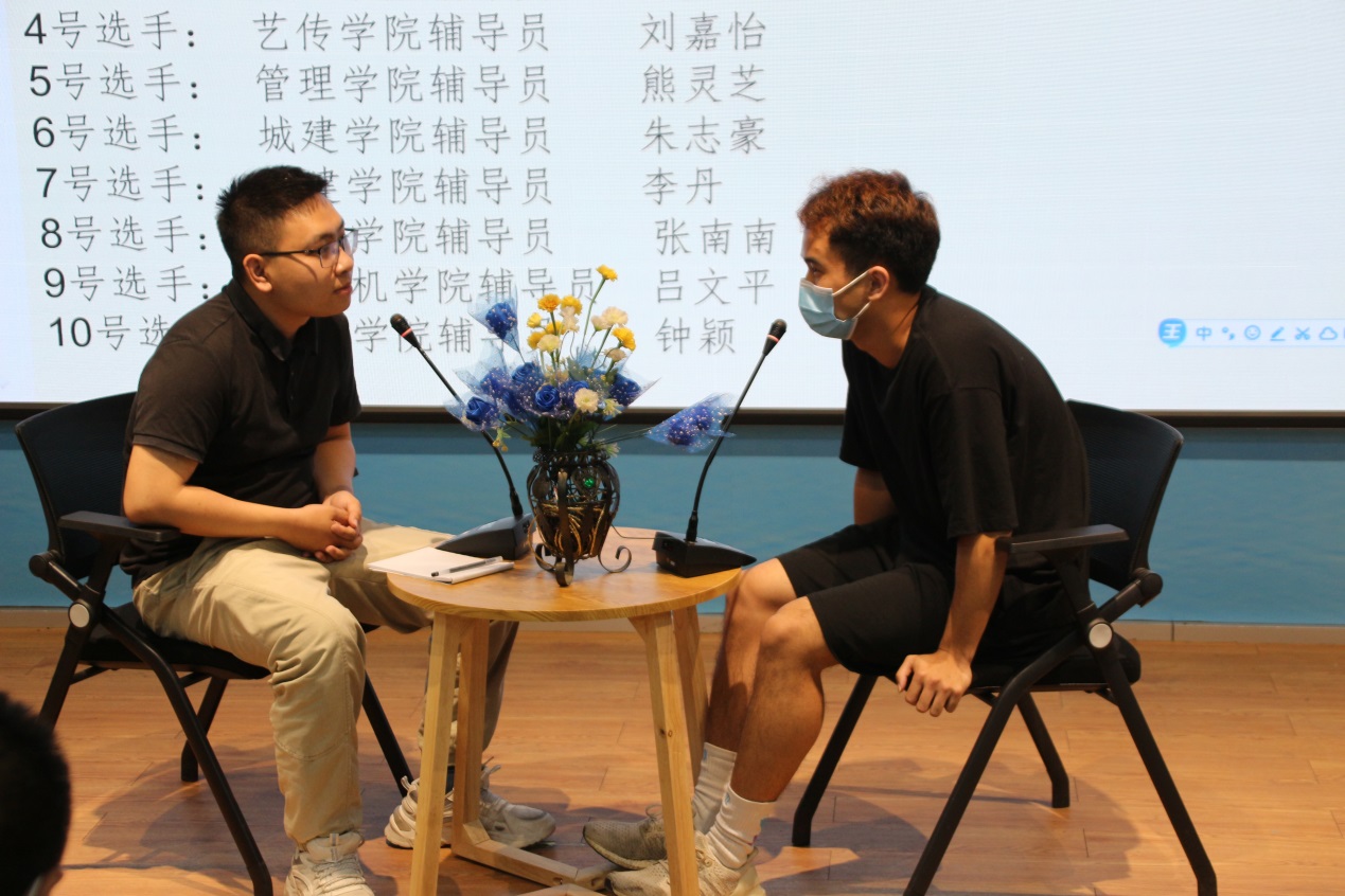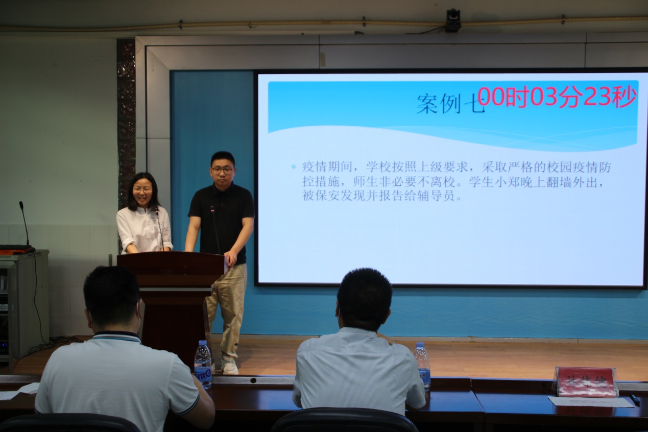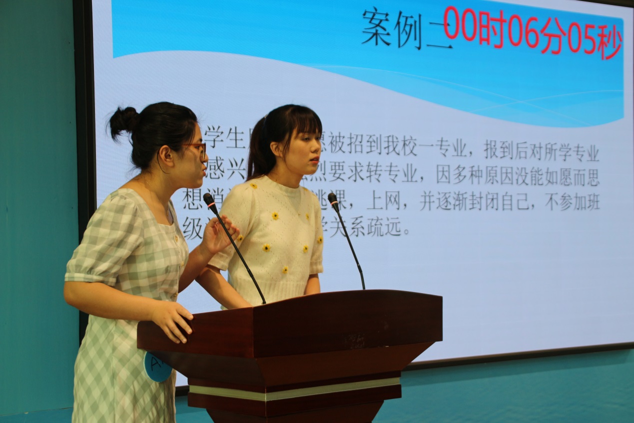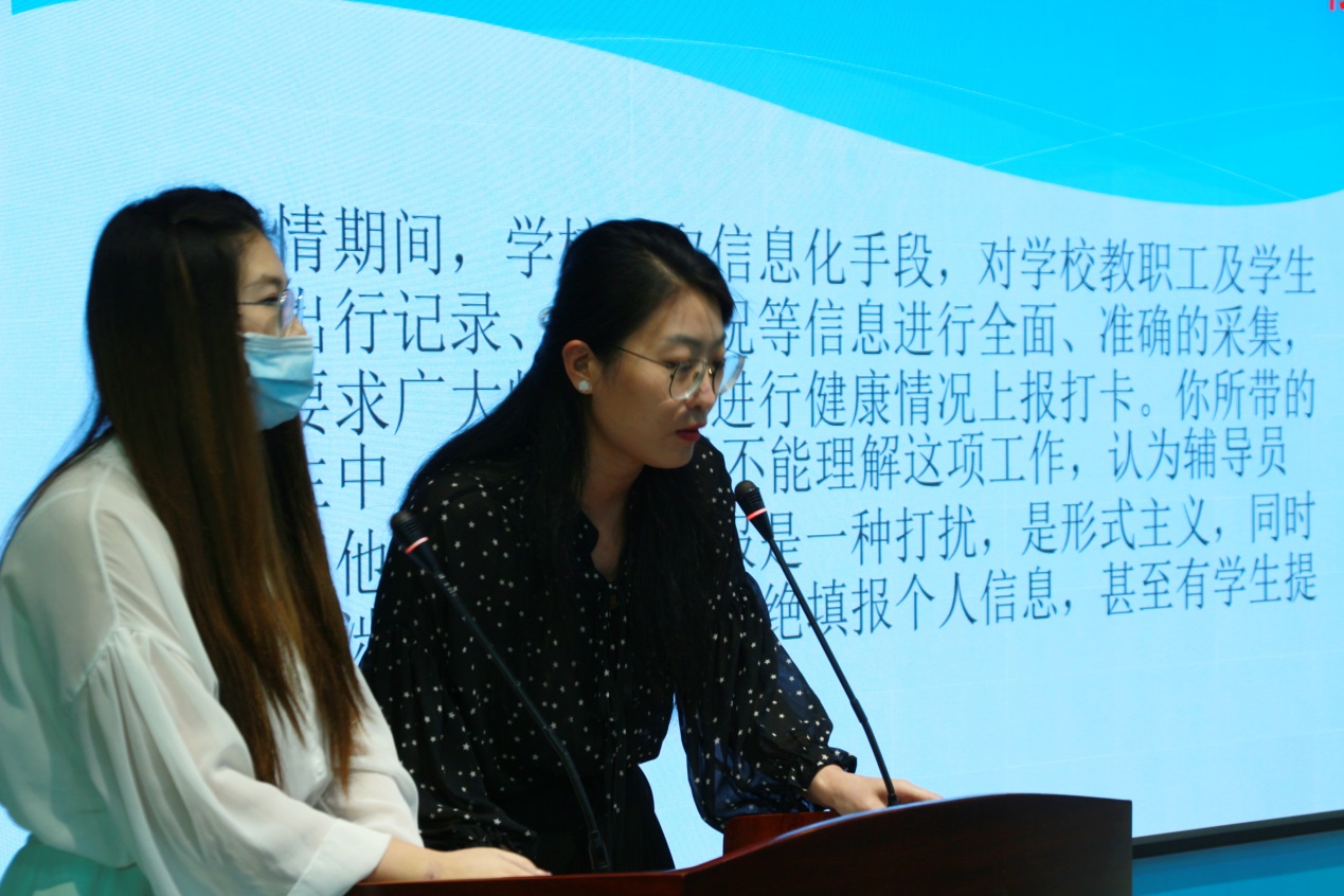 比賽分為案例研討和談心談話兩個項目,再現(xiàn)了當(dāng)下大學(xué)生思想政治教育和日常教育管理中的熱點難點問題,如疫情防控、價值取向、學(xué)業(yè)、就業(yè)、情感、人際關(guān)系、心理健康、學(xué)生干部培養(yǎng)等問題。案例研討以兩兩抽簽成組,“我提問,你回答”的方式開展。選手圍繞案例共同辨析原因、研討對策、總結(jié)規(guī)律。談心談話以情景再現(xiàn)的方式,參賽輔導(dǎo)員充分運用思想政治教育及相關(guān)學(xué)科原理、方法、策略,為“學(xué)生”答疑解惑、指明方向。參賽選手思路清晰、導(dǎo)向正確,充分展示了我校輔導(dǎo)員積極向上的精神面貌和較高的職業(yè)素養(yǎng)。