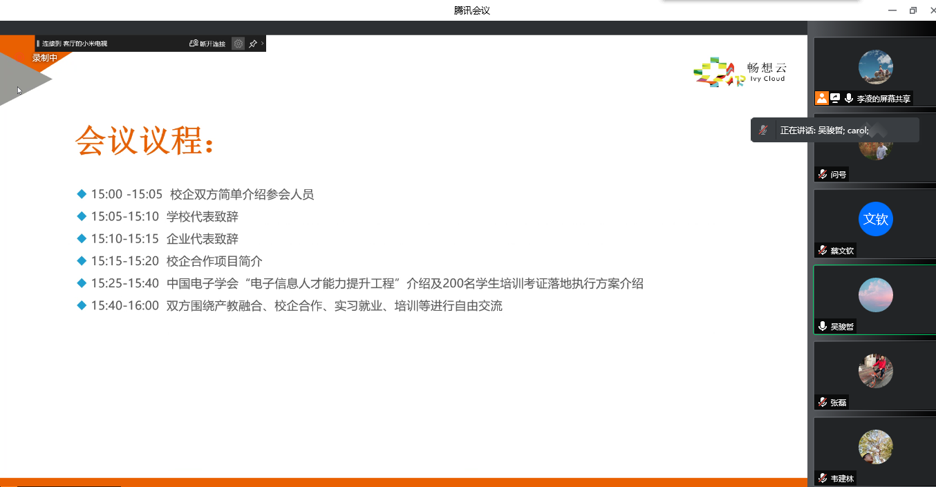 2022年4月22日下午,廣州華立科技職業(yè)學(xué)院與廣東省暢想云科技產(chǎn)業(yè)控股有限公司開展線上視頻交流會。暢想云公司董事長趙暢、常務(wù)副總裁吳駿哲、副總裁李凌、等級考試主任江俊杰、培訓(xùn)主任李廣,我校校長易健民博士教授、副校長高堯來、計算機學(xué)院院長王建華二級教授、實訓(xùn)中心主任張磊、校外教學(xué)與就業(yè)處處長鐘文浩、副科長韋建林、計算機學(xué)院辦公室主任蔡文欽等參加了線上會議。