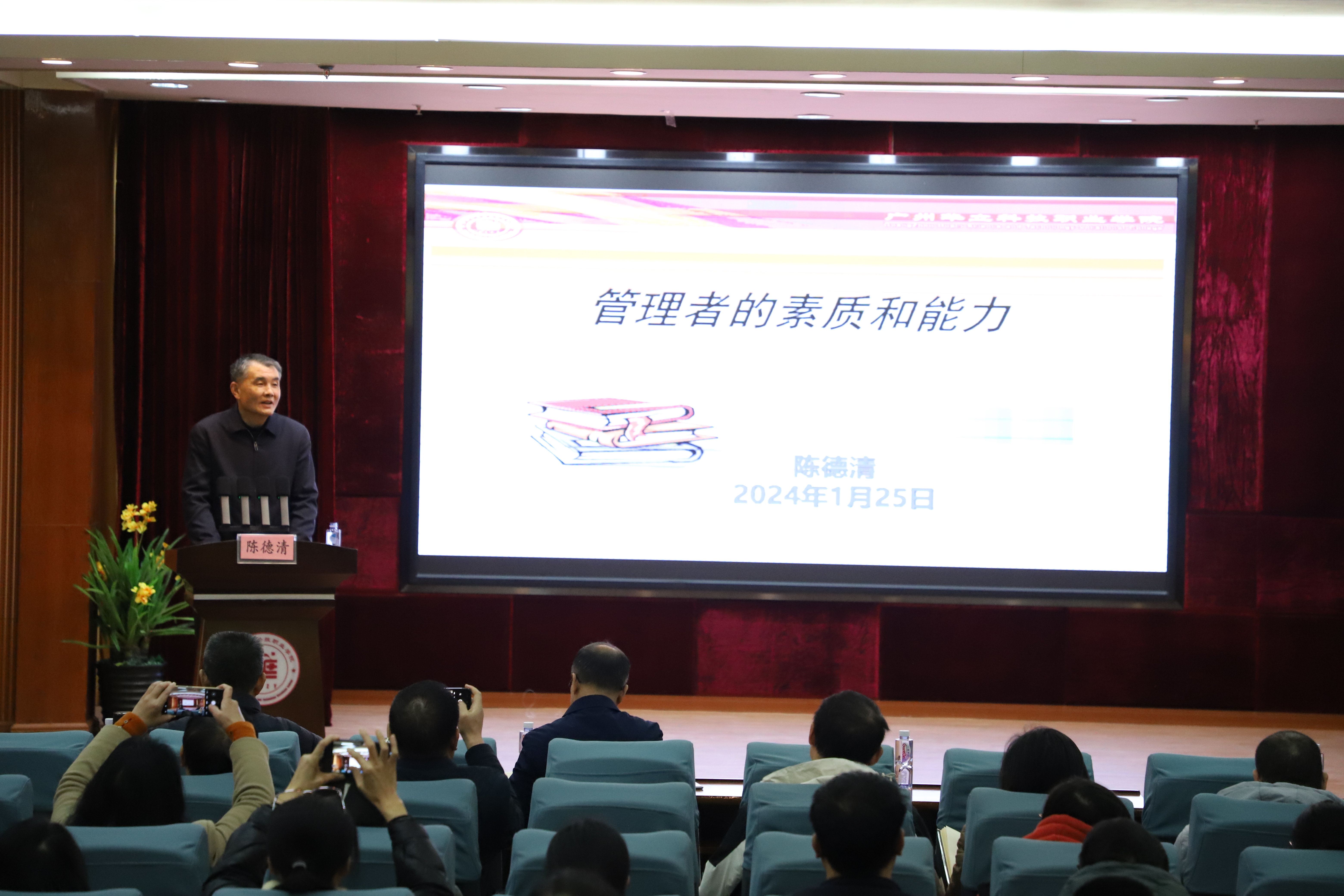 2024年1月25日下午,學(xué)校在圖書(shū)館一號(hào)報(bào)告廳舉辦了以“管理者的素質(zhì)和能力”為主題的專(zhuān)題講座,廣州華立科技職業(yè)學(xué)院校長(zhǎng)陳德清主講。黨委書(shū)記陳良聲、常務(wù)副校長(zhǎng)馬俊、副校長(zhǎng)陳顯強(qiáng)、高堯來(lái)、校長(zhǎng)助理葉春桃及全體行政人員、輔導(dǎo)員參加了本次活動(dòng)。專(zhuān)題講座由陳良聲主持。