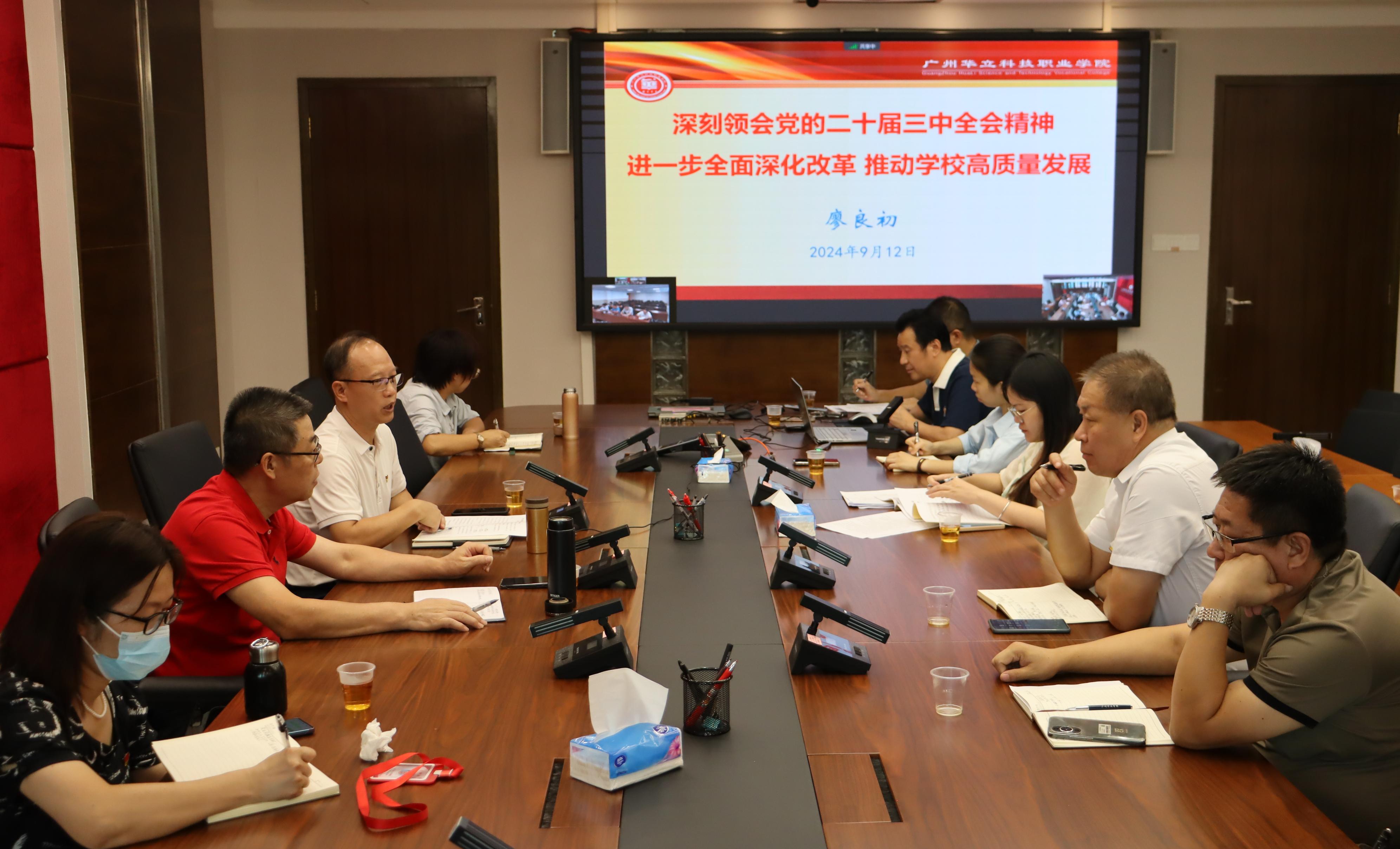9月12日下午,我校在行政樓305會(huì)議室召開黨委理論學(xué)習(xí)中心組(擴(kuò)大)學(xué)習(xí)會(huì)議,馬克思主義學(xué)院院長(zhǎng)廖良初教授作題為《深刻領(lǐng)會(huì)黨的二十屆三中全會(huì)精神,進(jìn)一步全面深化改革,推動(dòng)學(xué)校高質(zhì)量發(fā)展》的專題報(bào)告。黨委書記陳良聲主持會(huì)議,學(xué)校領(lǐng)導(dǎo)、黨委委員、紀(jì)委委員以及黨委各部門、各二級(jí)黨組織的負(fù)責(zé)人參加學(xué)習(xí)會(huì),云浮校區(qū)的相關(guān)領(lǐng)導(dǎo)通過視頻連線參加。