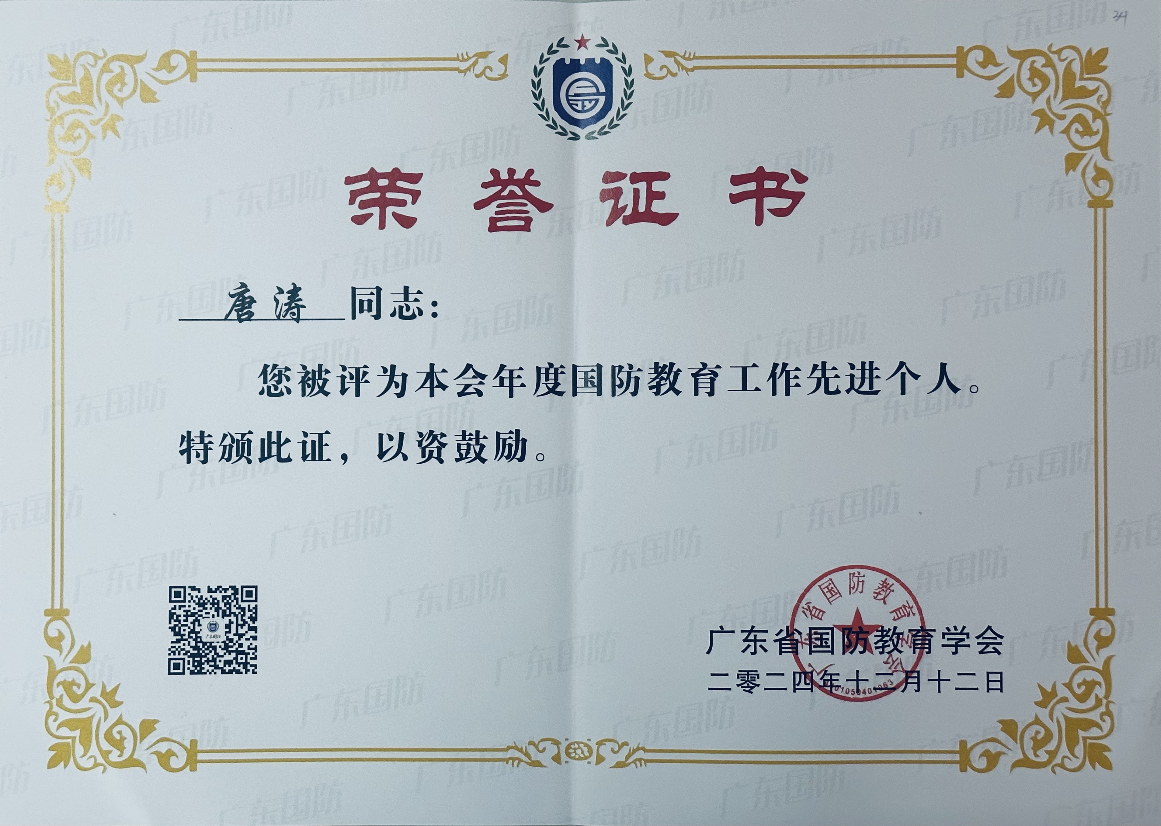 在廣東省國(guó)防教育學(xué)會(huì)組織的2024年度“國(guó)防教育先進(jìn)評(píng)選”活動(dòng)中,經(jīng)過嚴(yán)格評(píng)審與綜合考量,廣州華立科技職業(yè)學(xué)院憑借在國(guó)防教育領(lǐng)域內(nèi)的卓越貢獻(xiàn)與顯著成效,榮耀地被授予“國(guó)防教育先進(jìn)單位”稱號(hào)。同時(shí),我校陳勝軍、張志君、宋海泉、唐濤四位老師被聘為第三屆廣東省國(guó)防教育學(xué)會(huì)專家委員會(huì)成員,陳勝軍、唐濤兩位老師被授予“國(guó)防教育先進(jìn)個(gè)人”榮譽(yù)稱號(hào)。
