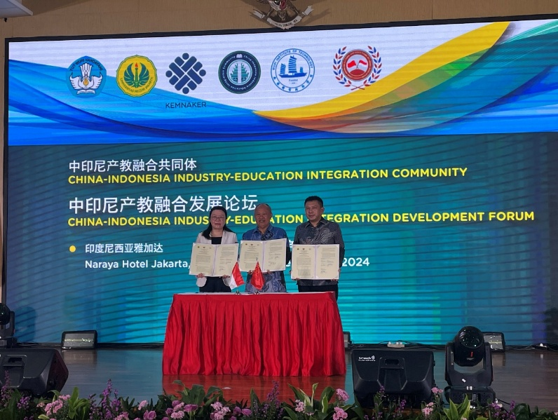 三位發(fā)起單位代表共同簽署“中印尼產(chǎn)教融合共同體”的合作文件