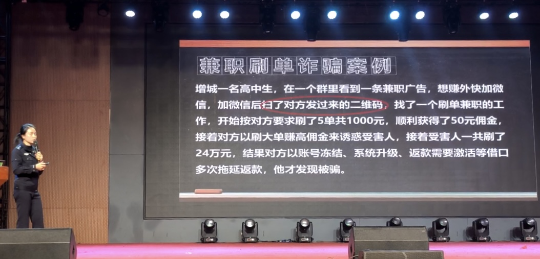 為進一步增強廣大師生的反詐意識,提升防范電信網(wǎng)絡(luò)詐騙的能力,切實維護校園安全穩(wěn)定,2月27日下午,我校聯(lián)合增城區(qū)公安分局在科技樓二樓召開“防范電信詐騙,共建平安校園”的反詐知識講座。本次講座由增城區(qū)公安局反詐中心資深警官擔(dān)任主講,吸引了全校近3000名師生積極參與。