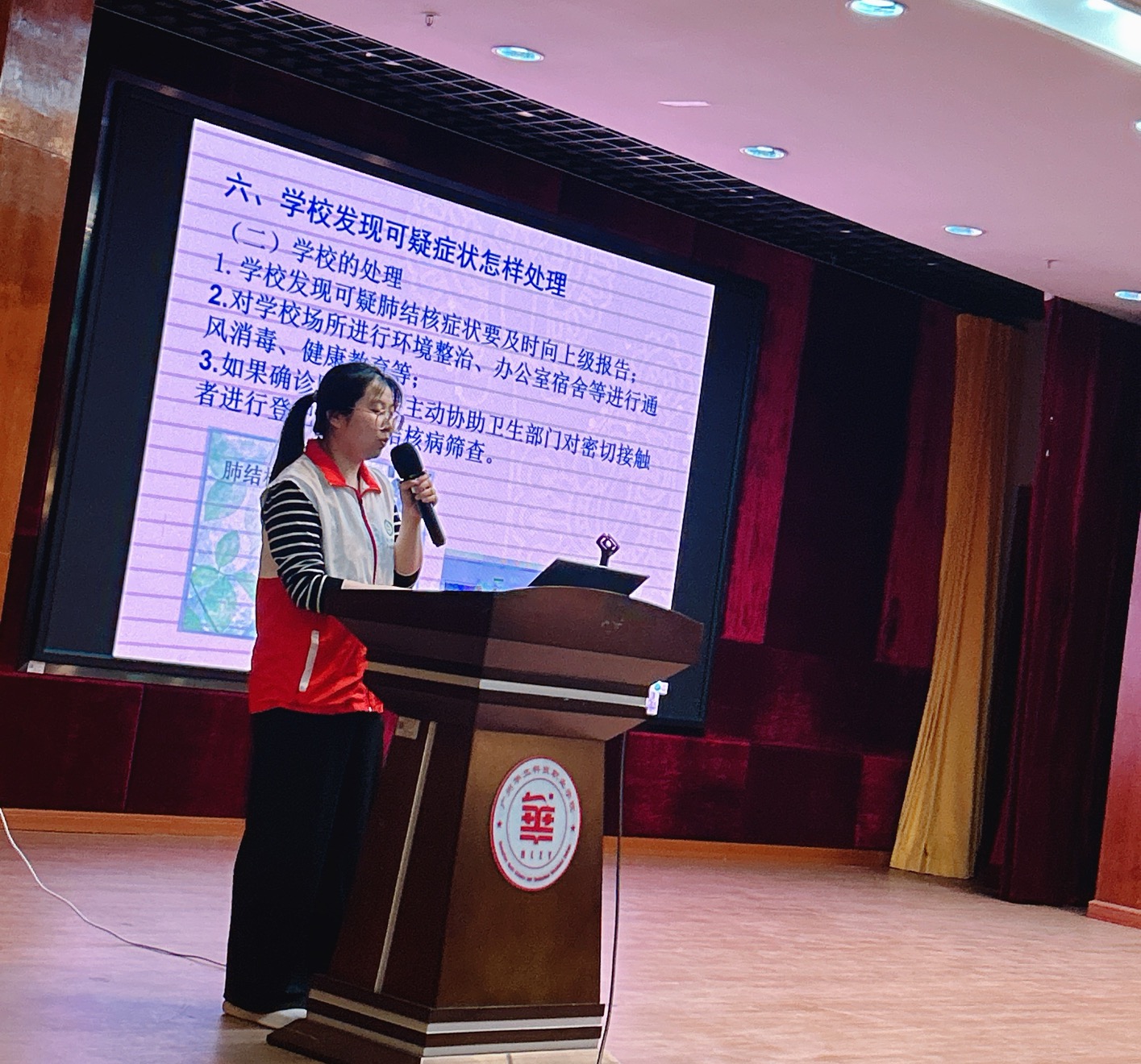 今年的主題是“全面行動、全力投入、全民參與、終結(jié)結(jié)核”。講座上,增江社區(qū)衛(wèi)生服務(wù)中心/防疫科專家黃春燕醫(yī)師圍繞這一主題,結(jié)合學(xué)校生活特點,用通俗易懂的語言,向師生們介紹了結(jié)核病的傳播途徑、常見癥狀、預(yù)防措施和治療方法,并強(qiáng)調(diào)了校園環(huán)境中預(yù)防結(jié)核病的重要性。