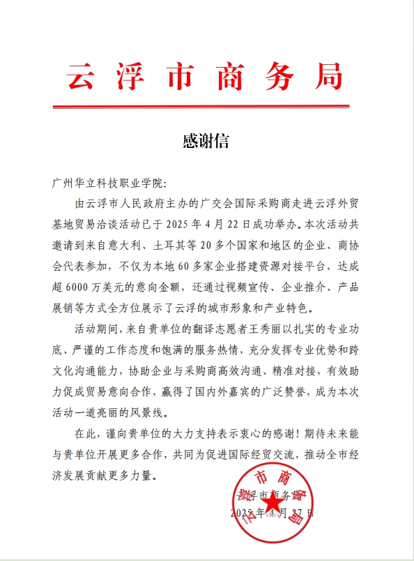 云浮市商務(wù)局向廣州華立科技職業(yè)學(xué)院發(fā)來感謝信