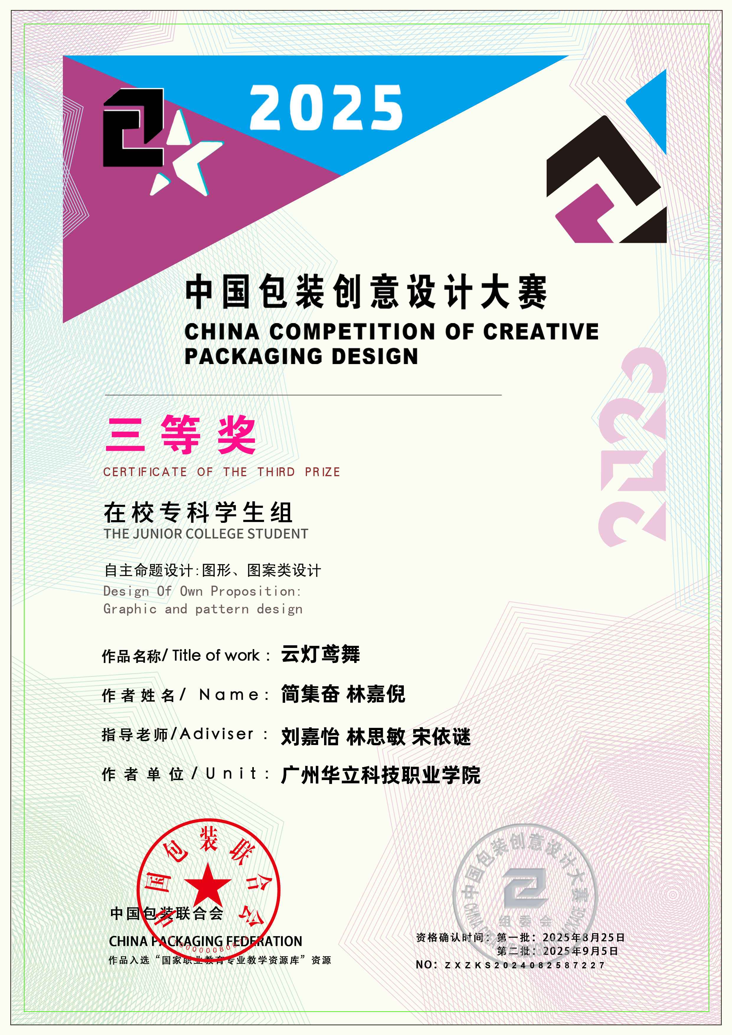 近日,2025中國包裝創(chuàng)意設(shè)計大賽獲獎名單正式公布,藝術(shù)與傳媒學(xué)院學(xué)生作品表現(xiàn)突出,作品《本草染韻》(作者:周壹航、 莊景輝、 黃舒敏,指導(dǎo)老師:陳改梅)榮獲全國三等獎;作品《山野珍饈 》(作者:吳其晃,指導(dǎo)老師:黎映如、 陳舒薇)榮獲全國三等獎;作品《繁華與齒》(作者:韋保燕、 張文鑫、 楊家雪,指導(dǎo)老師:黎映如、 陳舒薇)榮獲全國三等獎;作品《云燈鳶舞》(作者:簡集奮、林嘉倪,指導(dǎo)老師:劉嘉怡、林思敏、宋依謎)榮獲全國三等獎;作品《匠心——茶葉農(nóng)產(chǎn)品包裝設(shè)計》(作者:林燕津、梁嘉雯,指導(dǎo)老師:劉嘉怡、林思敏)榮獲全國三等獎。共斬獲國家級三等獎5項、優(yōu)秀獎6項,總計獲獎11項,充分展現(xiàn)了藝術(shù)與傳媒學(xué)院在設(shè)計教育與創(chuàng)新實踐方面的扎實成效。