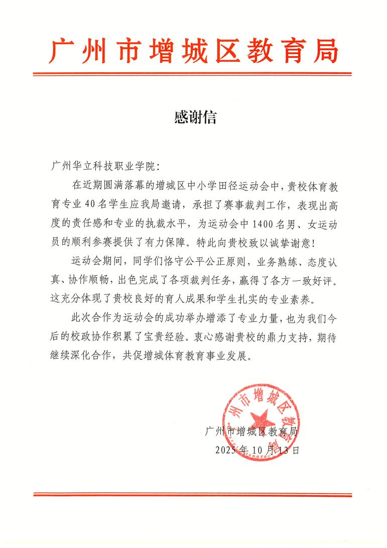 近日,我校藝術(shù)與傳媒學(xué)院收到來自增城區(qū)教育局的感謝信,對學(xué)院48名體育教育專業(yè)學(xué)生在“廣州市增城區(qū)中小學(xué)田徑運(yùn)動會”中擔(dān)任裁判員所展現(xiàn)出的專業(yè)素養(yǎng)與敬業(yè)精神表示高度贊揚(yáng)和誠摯感謝。此前,這批學(xué)子于2025年9月28日至30日受增城區(qū)教育局正式邀請,為運(yùn)動會中1400名男、女運(yùn)動員提供賽事執(zhí)裁服務(wù),同時他們以嚴(yán)謹(jǐn)?shù)膽B(tài)度、公正的判罰和出色的團(tuán)隊協(xié)作,贏得主辦方與參賽師生的一致好評。