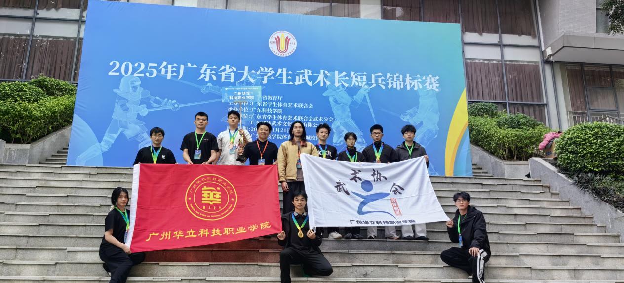 2025年11月22-23日,由廣東省教育廳、廣東省大學(xué)生體育藝術(shù)聯(lián)合會(huì)主辦的廣東省大學(xué)生武術(shù)長短兵錦標(biāo)賽在廣東科技學(xué)院圓滿落幕。廣州華立科技職業(yè)學(xué)院武術(shù)長短兵隊(duì) 首次亮相省級(jí)賽場(chǎng),10名參賽選手奮勇拼搏,最終斬獲2枚金牌、5枚銅牌,并取得團(tuán)體第七的好成績,實(shí)現(xiàn)“首次參賽即奪金”的歷史性突破,用實(shí)力書寫華立體育新篇章!