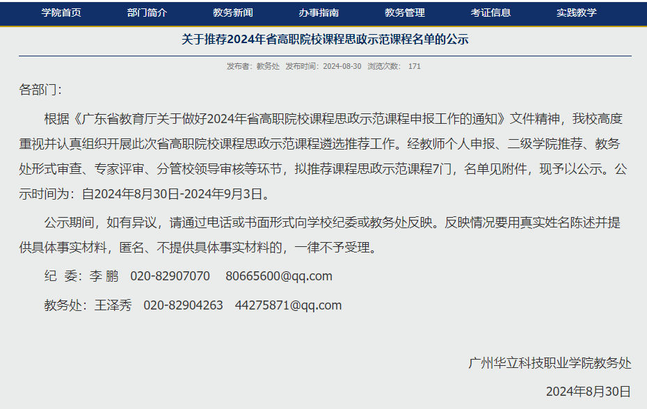 關(guān)于推薦2024年省高職院校課程思政示范課程名單的公示: