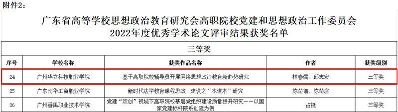 根據(jù)廣東省高等學(xué)校思想政治教育研究會(huì)、高職院校黨建和思想政治工作委員會(huì)《關(guān)于開展廣東省高職院校黨建和思想政治工作優(yōu)秀案例和學(xué)術(shù)論文征集評(píng)選活動(dòng)的通知》要求,為進(jìn)一步學(xué)習(xí)貫徹習(xí)近平新時(shí)代中國特色社會(huì)主義思想和黨的二十大精神,提升學(xué)校黨建和思想政治工作質(zhì)量,推動(dòng)新時(shí)代黨建和思想政治工作守正出新,學(xué)校黨委辦公室、黨委宣傳部、馬克思主義學(xué)院認(rèn)真組織開展黨建和思想政治工作優(yōu)秀案例和學(xué)術(shù)論文征集活動(dòng),各二級(jí)黨組織廣泛發(fā)動(dòng)、積極參與,學(xué)校擇優(yōu)推薦上報(bào)的2篇案例、1篇論文均獲獎(jiǎng)。其中王澤秀撰寫的案例《紅心引領(lǐng)、德技并修,全方位打造課程思政建設(shè)“主戰(zhàn)場”品牌案例》、梁國英等同志撰寫的案例《以史育人,傳承精神——情景浸潤式校館聯(lián)動(dòng)“大思政課”建設(shè)品牌案例》榮獲優(yōu)秀典型案例三等獎(jiǎng),林春儒、邱志宏撰寫的學(xué)術(shù)論文《基于高職院校輔導(dǎo)員開展網(wǎng)絡(luò)思想政治教育新趨勢(shì)研究》榮獲優(yōu)秀學(xué)術(shù)論文三等獎(jiǎng)。