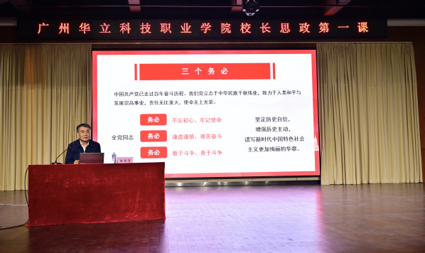 3月21日晚,廣州華立科技職業(yè)學(xué)院校長(zhǎng)陳德清教授在圖書館八樓報(bào)告廳給700多名學(xué)生講授了2024年春季學(xué)期思政第一課。黨委副書記、副校長(zhǎng)王洪艷,馬克思主義學(xué)院教師、黨委辦公室和各二級(jí)學(xué)院黨務(wù)干部共同聆聽。思政第一課由馬克思主義學(xué)院黨支部書記、院長(zhǎng)廖良初主持。
