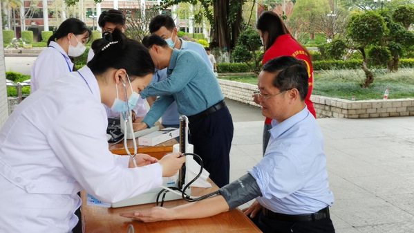 雷毅雄院長帶領(lǐng)同學(xué)們?yōu)閹熒鷾y量血壓,并根據(jù)每個(gè)人的具體情況給予針對(duì)性的健康建議,解答師生們的疑問并及時(shí)普及高血壓的危害、預(yù)防措施以及日常生活中如何控制血壓等知識(shí)。