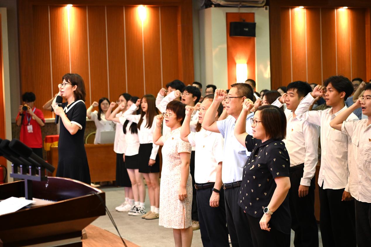大會(huì)在莊嚴(yán)的國歌聲中拉開序幕,面對鮮紅的中國共產(chǎn)黨黨旗,黨委委員、校長助理葉春桃同志帶領(lǐng)新黨員莊嚴(yán)宣誓、老黨員重溫入黨誓詞。