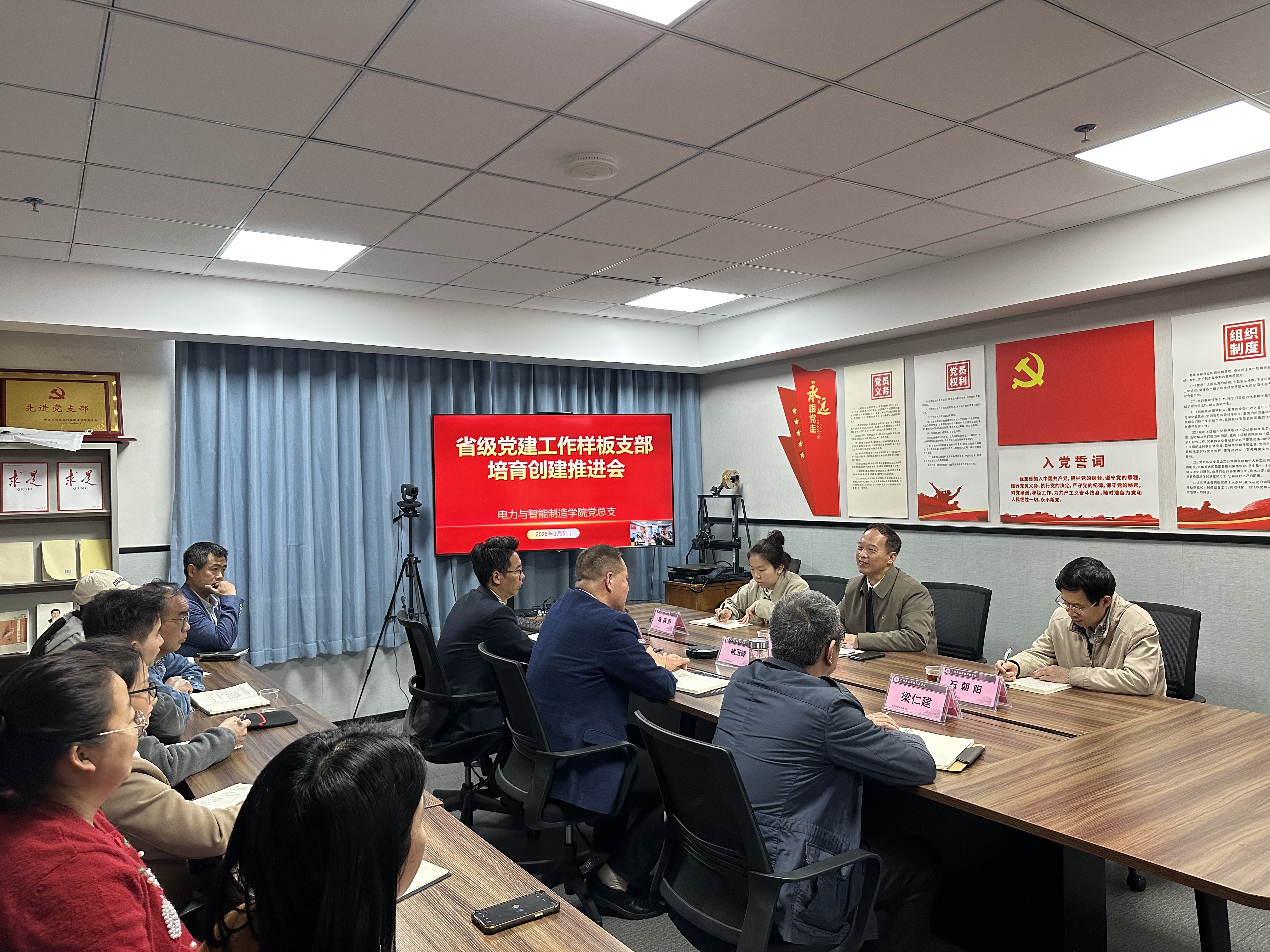 為做好“全省黨建工作樣板支部”創(chuàng)建工作,電力與智能制造學(xué)院教師黨支部于2025年3月5日下午召開了“全省黨建工作樣板支部”培育創(chuàng)建推進會。學(xué)校黨委書記陳良聲,黨辦主任石朝陽、組織部副部長陳曉薇參加了本次會議,會議由教師黨支部書記孫令真主持。