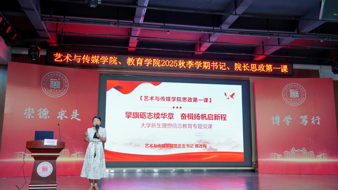 為引導(dǎo)和幫助青年學(xué)子學(xué)會用習(xí)近平新時代中國特色社會主義思想的先進理論武裝頭腦,將個人成長與民族復(fù)興緊密相連,扣好人生“第一粒扣子”,9月11日晚,藝術(shù)與傳媒學(xué)院黨總支書記陳改梅老師以 “擎旗礪志續(xù)華章 奮楫揚帆啟新程”為主題,在圖書館八樓報告廳,為藝術(shù)與傳媒學(xué)院、教育學(xué)院新生帶來了情感觸動強烈、思想啟迪深刻的“思政第一課”。學(xué)院院長朱君、教師黨員和2025級新生參加聽課。
