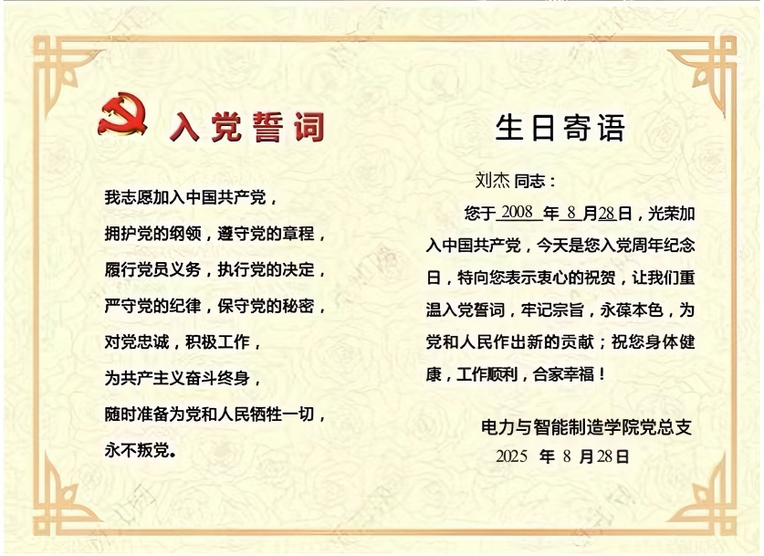 劉杰是電力與智能制造學院教師黨支部的一名教師黨員,8月28日早上,她收到了學院黨組織發(fā)來的“政治生日”賀卡。轉眼間,加入中國共產(chǎn)黨已經(jīng)17年。
