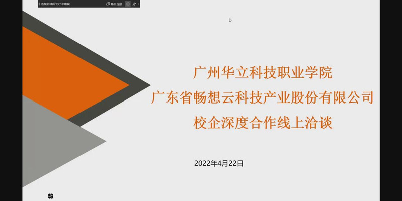 2022年4月22日下午,廣州華立科技職業(yè)學(xué)院與廣東省暢想云科技產(chǎn)業(yè)控股有限公司開展線上視頻交流會(huì)。暢想云公司董事長趙暢、常務(wù)副總裁吳駿哲、副總裁李凌、等級(jí)考試主任江俊杰、培訓(xùn)主任李廣,我校校長易健民博士教授、黨委副書記、副校長高堯來、計(jì)算機(jī)學(xué)院院長王建華二級(jí)教授、實(shí)訓(xùn)中心主任張磊、校外教學(xué)與就業(yè)處處長鐘文浩、副科長韋建林、計(jì)算機(jī)學(xué)院辦公室主任蔡文欽等參加了線上會(huì)議。