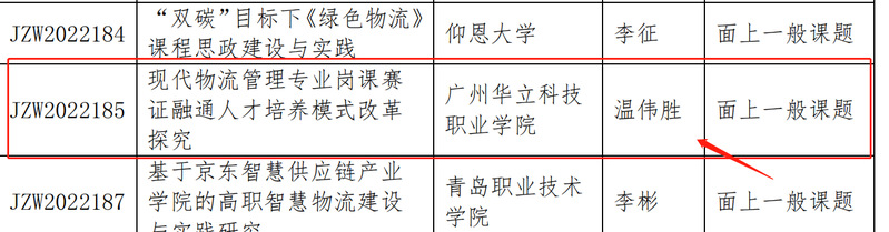 根據(jù)《關于申報2022年全國高校、職業(yè)院校物流教改教研課題的通知》(物學字〔2022〕5號),中國物流學會、教育部高等學校物流管理與工程類專業(yè)教學指導委員會和全國物流職業(yè)教育教學指導委員會共同研究啟動了2022年全國高校、職業(yè)院校物流教改教研課題申報工作。本次申報選題涉及物流行業(yè)發(fā)展與區(qū)域人才需求、物流專業(yè)數(shù)字化轉(zhuǎn)型、課程思政建設、教學改革、創(chuàng)新創(chuàng)業(yè)、產(chǎn)教融合與校企合作、師資隊伍建設、課程與資源建設、教學評價體系構(gòu)建與研究、1+X證書制度試點等方面。經(jīng)自主申報、資格審查、專家評審、綜合評議等程序,最終決定366項課題(其中培育課題15項,面上課題351項)列入“2022年全國高校、職業(yè)院校物流教改教研課題計劃名單”。其中我校王洪艷老師的課題《數(shù)字經(jīng)濟背景下現(xiàn)代物流管理專業(yè)產(chǎn)教融合協(xié)同育人模式重構(gòu)》和溫偉勝老師的課題《現(xiàn)代物流管理專業(yè)崗課賽證融通人才培養(yǎng)模式改革探究》順利入選。