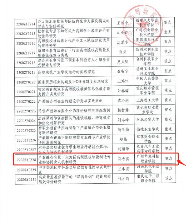 中國(guó)高等教育學(xué)會(huì)于2022年5月啟動(dòng)了“2022年度高等教育科學(xué)研究規(guī)劃課題”申報(bào)工作,經(jīng)資格審查、匿名會(huì)議評(píng)審、公示后,予以正式公布。根據(jù)中國(guó)高等教育學(xué)會(huì)《關(guān)于公布“2022年度高等教育科學(xué)研究規(guī)劃課題”立項(xiàng)名單的通知》(高學(xué)會(huì)〔2022〕89號(hào))獲悉,我校孫令真老師申報(bào)的課題《產(chǎn)教融合背景下大灣區(qū)高職院校智能制造專業(yè)群協(xié)同育人機(jī)制研究》獲重點(diǎn)課題立項(xiàng)建設(shè)。