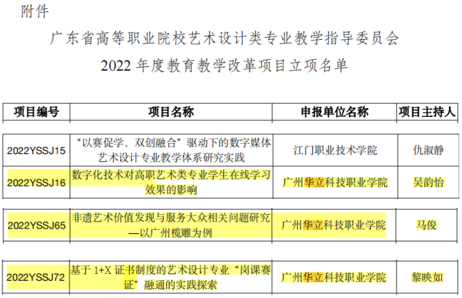 廣東省高等職業(yè)院校藝術(shù)設(shè)計(jì)類專業(yè)教學(xué)指導(dǎo)委員會(huì)于今年8月啟動(dòng)2022年度教育教學(xué)改革項(xiàng)目申報(bào)工作,經(jīng)各高職院校自主申報(bào)、資格審查及專家評(píng)審等程序,公示無(wú)異議,予以正式公布。根據(jù)《廣東省高等職業(yè)院校藝術(shù)設(shè)計(jì)類專業(yè)教學(xué)指導(dǎo)委員會(huì)關(guān)于公布2022 年度教育教學(xué)改革項(xiàng)目立項(xiàng)結(jié)果的通知》(粵高職藝術(shù)設(shè)計(jì)教指委〔2022〕04 號(hào)),我校吳韻怡、馬俊、黎映如三位老師的項(xiàng)目獲立項(xiàng)建設(shè),具體名單見下圖: