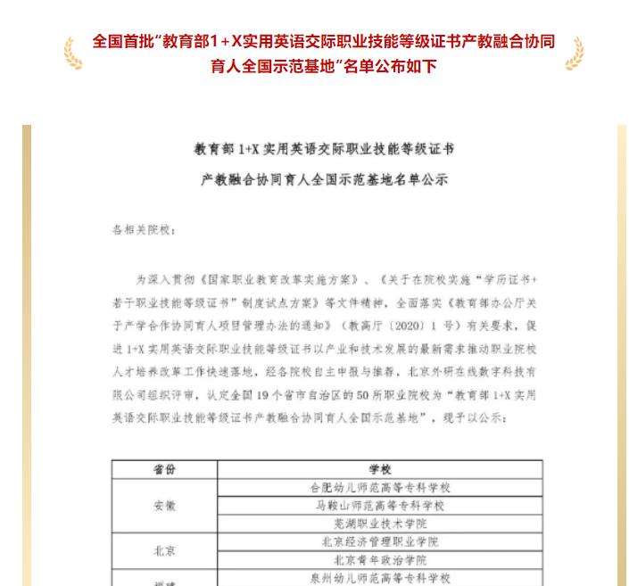 為建設(shè)具有示范引領(lǐng)效應(yīng)的產(chǎn)教融合平臺和協(xié)同育人基地,打造全方位推動職業(yè)外語教育高質(zhì)量發(fā)展,我校經(jīng)濟管理學(xué)院商務(wù)英語系主任謝慧琪老師帶領(lǐng)團隊,通過認(rèn)真研討相關(guān)文件,結(jié)合學(xué)校與學(xué)院的實際,在團隊成員的共同努力下,申報的2023年1+X證書實用英語交際職業(yè)技能等級證書(VETS)產(chǎn)教融合協(xié)同育人全國示范基地成功獲得立項。