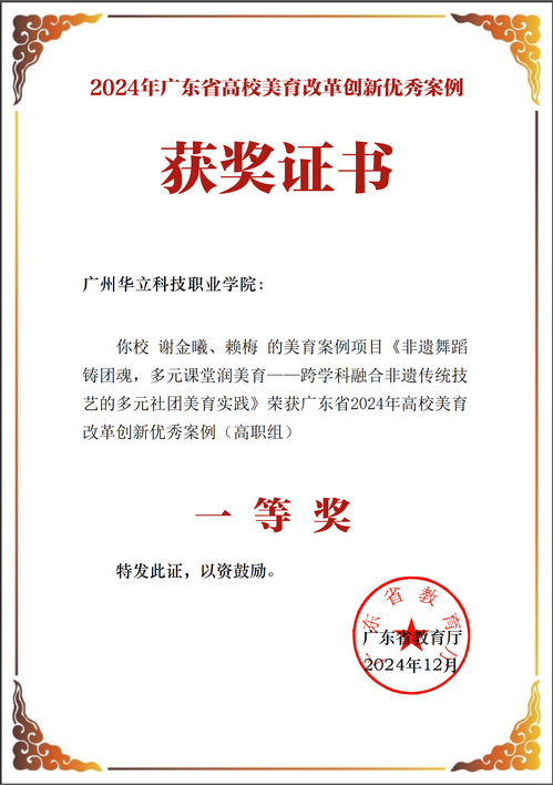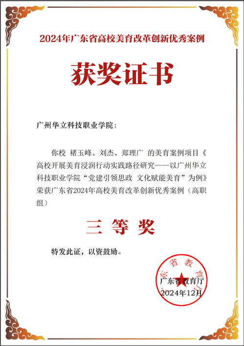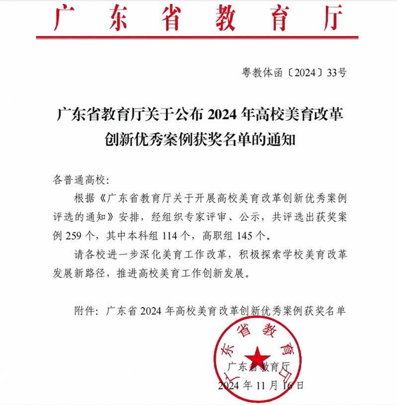 該項(xiàng)評(píng)選是廣東省教育廳為貫徹落實(shí)中共中央辦公廳、國務(wù)院辦公廳印發(fā)的《關(guān)于全面加強(qiáng)和改進(jìn)新時(shí)代學(xué)校美育工作的意見》,深化全省高校美育工作綜合改革,推動(dòng)高校美育工作創(chuàng)新發(fā)展,形成具有引領(lǐng)性、突破性、示范性的做法、舉措和經(jīng)驗(yàn),推進(jìn)全省高校美育工作創(chuàng)新發(fā)展而開展的案例評(píng)選活動(dòng)。經(jīng)省廳組織專家評(píng)審、公示,共評(píng)選出獲獎(jiǎng)案例 259 個(gè),其中本科組 114 個(gè),高職組 145 個(gè)。此次案例獲獎(jiǎng)也充分展示了我校在美育改革創(chuàng)新工作中的突出成效,后續(xù)學(xué)校將進(jìn)一步深化美育工作改革,積極探索學(xué)校美育改革發(fā)展新路徑,推進(jìn)我校美育工作創(chuàng)新發(fā)展。