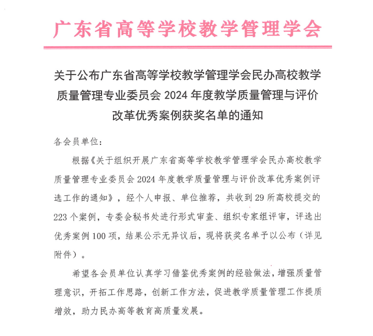 近日,廣東省高等學(xué)校教學(xué)管理學(xué)會(huì)民辦高校教學(xué)質(zhì)量管理專業(yè)委員會(huì)公布了2024 年度教學(xué)質(zhì)量管理與評價(jià)改革優(yōu)秀案例獲獎(jiǎng)名單,我校陳漢成團(tuán)隊(duì)的案例獲二等獎(jiǎng),廖良初團(tuán)隊(duì)和甘英浩團(tuán)隊(duì)的案例獲優(yōu)秀獎(jiǎng),體現(xiàn)了我校在教學(xué)質(zhì)量管理與評價(jià)改革中的成效。