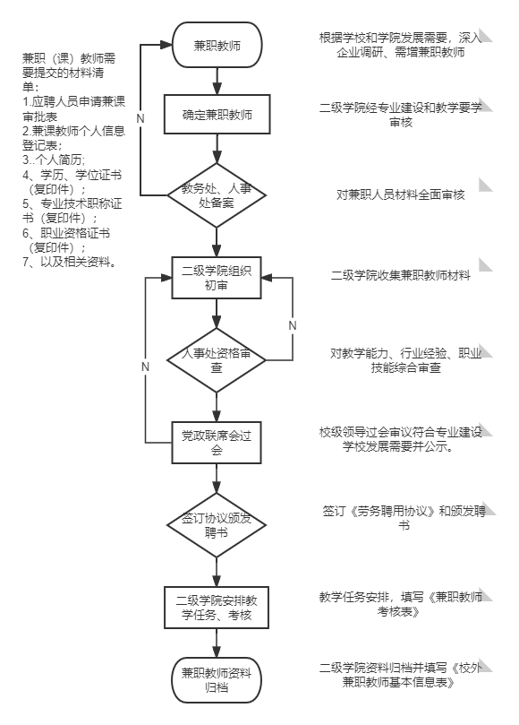 1.二級學(xué)院根據(jù)校內(nèi)外教學(xué)任務(wù),在校教師和兼職教師情況擬聘兼職教師,報教務(wù)處、人事處審核;