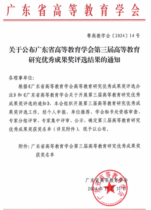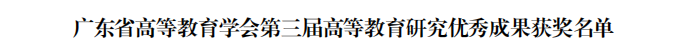 廣東省高等教育學(xué)會高等教育研究優(yōu)秀成果獎每兩年評選一次,參評成果分學(xué)術(shù)論文類、學(xué)術(shù)著作類和研究報告及其他類。旨在充分調(diào)動和發(fā)揮廣大高等教育工作者開展高等教育理論與實(shí)踐研究的積極性、主動性和創(chuàng)造性,助力我省高等教育研究高質(zhì)量發(fā)展。本次獲獎充分展示了我校教師在高等教育研究方面的學(xué)術(shù)水平和區(qū)域影響力。今后,學(xué)校將圍繞升本目標(biāo),繼續(xù)加強(qiáng)教學(xué)成果獎的申報,推動產(chǎn)出更多高質(zhì)量的成果。