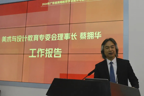 隨后,美術(shù)與設(shè)計(jì)教育專委會(huì)理事長(zhǎng)、廣東美術(shù)學(xué)院副校長(zhǎng)蔡擁華作了工作報(bào)告。他回顧了過去一年的工作成果,特別提到了習(xí)近平新時(shí)代中國(guó)特色社會(huì)主義思想的指導(dǎo)作用,以及十二屆三中全會(huì)的精神指引。蔡擁華強(qiáng)調(diào),新時(shí)代美育教育不僅要在高校內(nèi)部深入貫徹社會(huì)主義核心價(jià)值觀,還要通過各類大賽和實(shí)踐活動(dòng),弘揚(yáng)社會(huì)主義先進(jìn)文化,增強(qiáng)學(xué)生的文化自信。他還介紹了“新時(shí)代新生活新美學(xué)”系列活動(dòng),展示了廣東高校在美育領(lǐng)域的最新成果。