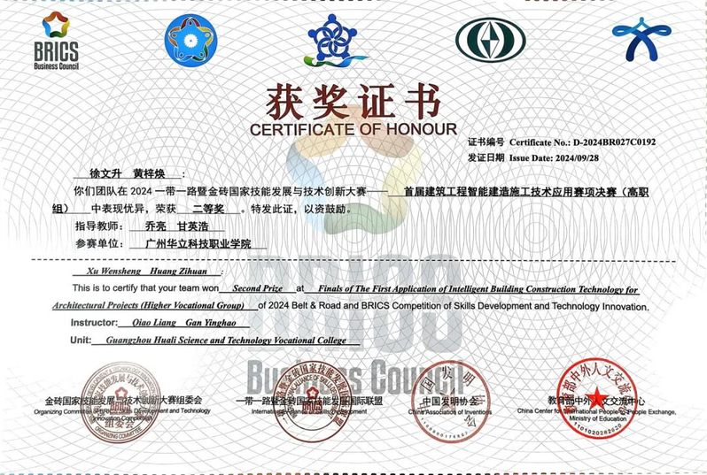 近日,2024一帶一路暨金磚國家技能發(fā)展與技術(shù)創(chuàng)新大賽首屆建筑工程智能建造施工技術(shù)應(yīng)用賽項(xiàng)(BRICS-ST-027)全國總決賽在浙江杭州舉辦。本次決賽匯聚了來自全國28個(gè)地區(qū)382所院校的415支隊(duì)伍,共計(jì)1500余名優(yōu)秀選手參賽。其中孟加拉國、加納共和國及馬來西亞的6名國際留學(xué)生也參與其中。經(jīng)過激烈角逐,我校城建學(xué)院學(xué)生徐文生、黃梓煥脫穎而出,榮獲全國二等獎(jiǎng)的佳績,指導(dǎo)教師喬亮、甘英浩被授予“優(yōu)秀指導(dǎo)教師”榮譽(yù)稱號,此外,我校憑借前期周密細(xì)致的組織工作,贏得了組委會的高度認(rèn)可,并榮獲“優(yōu)秀組織獎(jiǎng)”。
